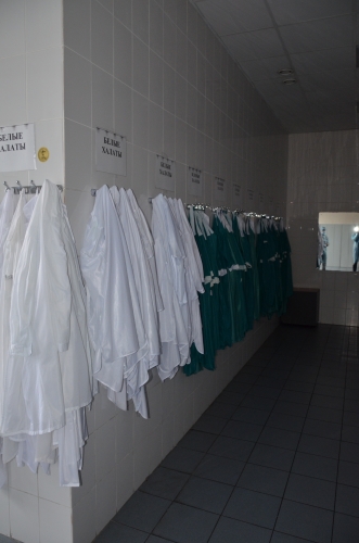 Переступаем порог завода и попадаем в помещение где работники, при необходимости принимают душ, облачаются в рабочую одежду. На стенах висят халаты разного цвета, один цвет — одно рабочее помещение (или процесс), поскольку считается нежелательным пересечение работников из зон с разным уровнем риска.