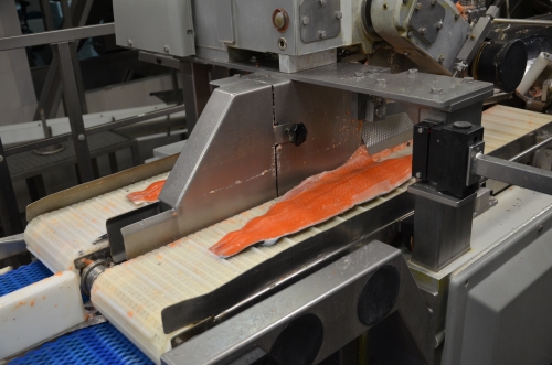Следующий этап — формирование того самого куска семги, который так аппетитно выглядит на витрине магазинов. Филе рыбы выкладывается на конвейер, который подает её на специальную умную машину которая сначала вычисляет, а потом делает оптимальный рез рыбы. Как это делается, за гранью моего понимания ;)